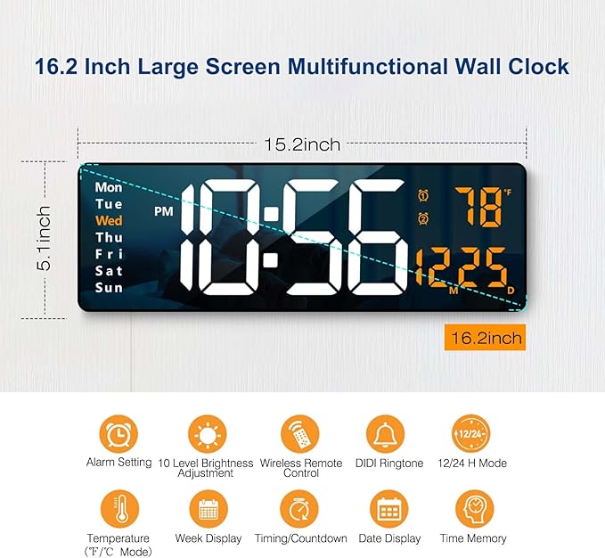 - 【16.2 Inch Large LED Display】The digital clock has a 16.2 inch large screen display, 4 inch high contrast clear jumbo digits make it much easier to read even from a distance and from all angles. Here are all the features that you might expect for a digital wall clock: Time, Date, Week, and Temperature. ATTENTION: Must be plugged in to work. Not battery operated.