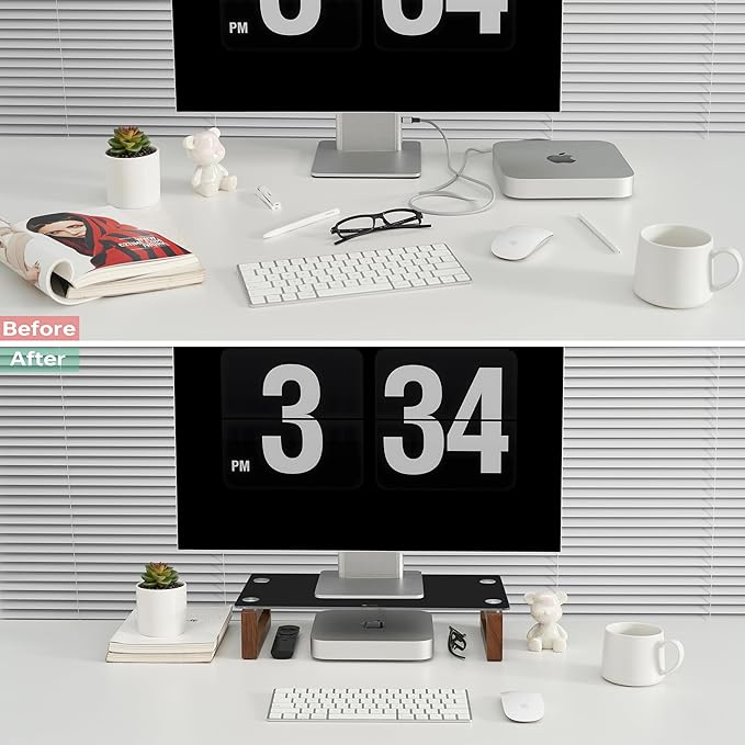 - MULTIFUNCTIONAL | Our sleek design monitor riser elevates screen by 3.5" to a comfortable ergonomic viewing position to promote better posture, reduce eyestrain and neck pain. Create additional space underneath the stand to conveniently store devices such as apple magic keyboard, mouse, Ipad, laptop or other office supplies.