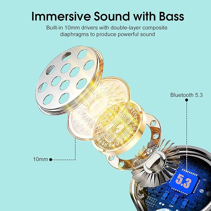 - [High-fidelity Audio and Clear Calls]: The wireless bluetooth headphones features a 10mm speaker and a volume-optimized active equalizer that maintains audio clarity and balance. With a highly supple diaphragm that reproduces a rich bass range while enhancing sound quality and reducing distortion, you'll hear clear HD stereo sound and powerful bass. A hands-free earphones with noise-canceling microphone makes calls easier and clearer to hear.