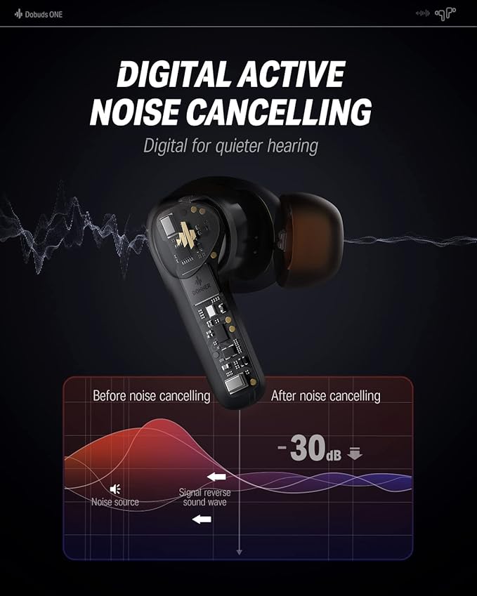 - 【32 - hour battery life, Music all day】 With a Type-C port and rapid charging technology, every 10 minutes charging gives 2 hours of music playback. This increases the usage time allowing to recharge them less frequent. The single-ear battery life is 8 hours (when ANC off), and the charging case can complete 3 full charging cycles. Dobuds ONE with a total of 32 hours, for being your long lasting companion.