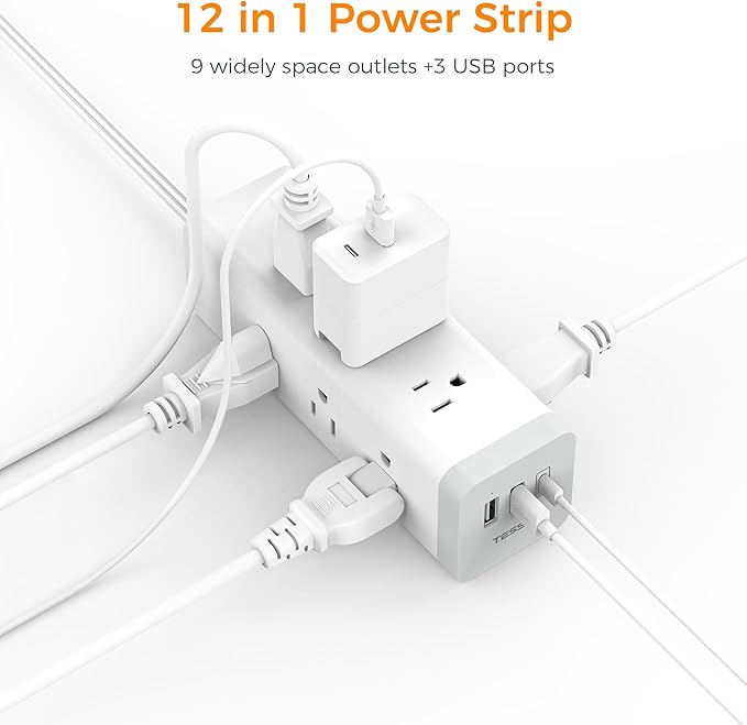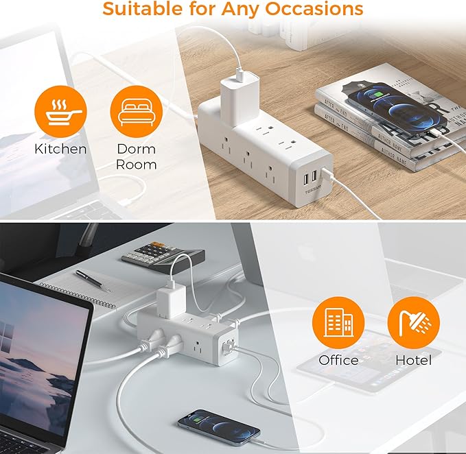 - 12 in 1 Power Strip: This usb extension cord 10 feet could turn 1 socket into 9 AC outlets and 3 USB ports, can charge 9 devices simultaneously without blocking, keep your desktop organized; You can use it in any indoor place such as home, office and dorm room