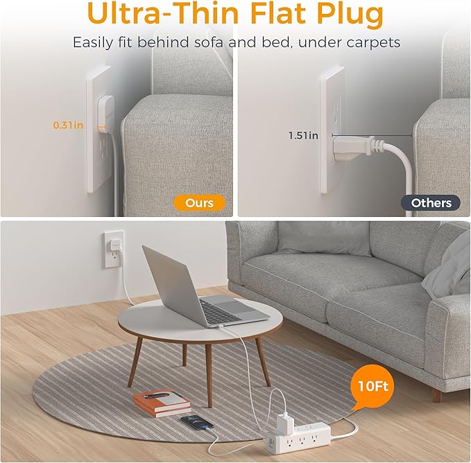 - Flat Extension Cord 10 ft: With only 0.31 in ultra thin flat head design, flat power strip 10 ft can easily fit in tight spots and hide behind sofa, bed, nightstand or other furniture, sitting flush against the wall; 45° right angle design create an extra space for other plug below without blocking