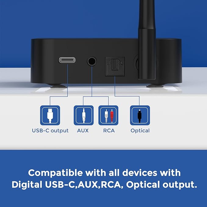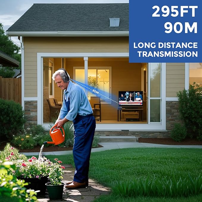 - Hassle-Free Set Up & Wide Compatibility: Turn on the transmitter and our wireless headphones for TV, they will be automatically connected. support most TVs with Optical Audio,AUX(3.5mm), RCA, or USB digital output port. While our wireless headphones for tv watching also can be worked as a sperately Bluetooth 5.3 headset,which directly connect it with your mobile phone, laptop, AV receiver and so on via Bluetooth.
