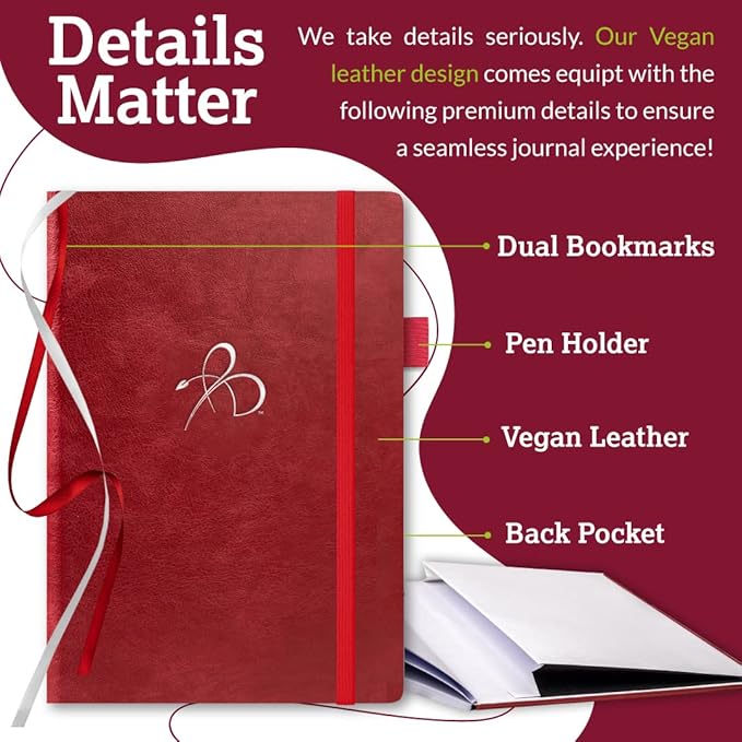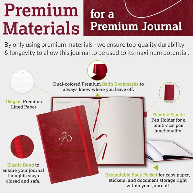 - Premium Features: Created with rich details, this lined notebook journal is designed with two satin bookmarks and a flexible elastic pen holder. The expandable back pocket of our leather notebook journal makes storing your essentials easy while the elastic band ensures your blank journal book stays safe.