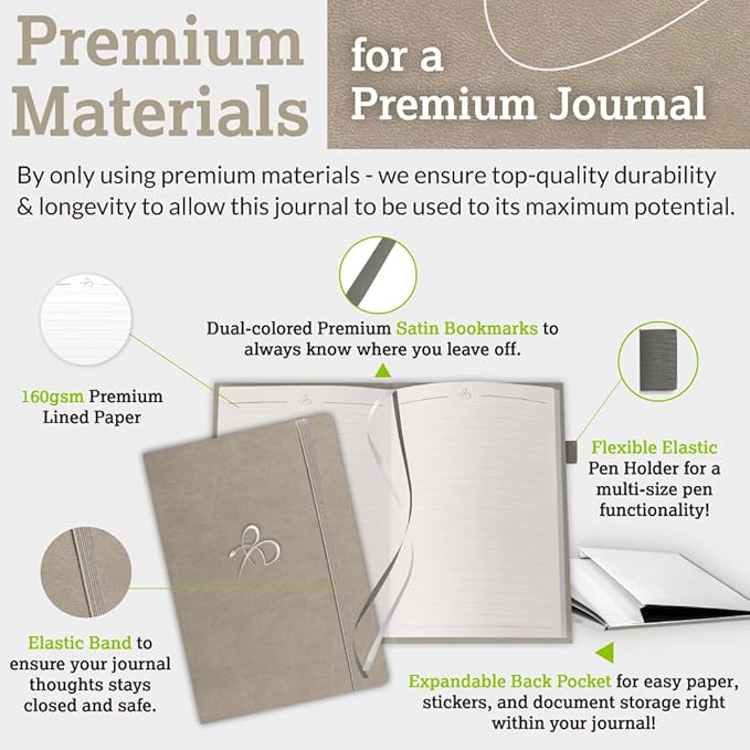 - Premium Features: Created with rich details, this lined notebook journal is designed with two satin bookmarks and a flexible elastic pen holder. The expandable back pocket of our leather notebook journal makes storing your essentials easy while the elastic band ensures your blank journal book stays safe.