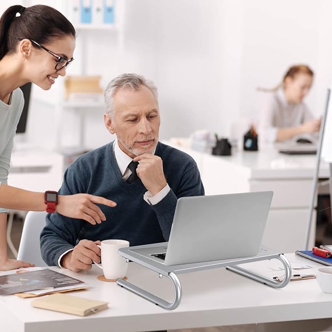 - Organization: Sleek modern silver design complements any desk and the extra space underneath the platform for a neat surface.