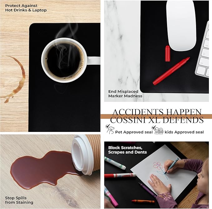 - Oops! Block kid, pet & you damage: heat. Spills. Stains. Scratches. Coffee cup rings, moisture, water, drinks, ink, dirt, scuffs, and even your clients crazy toddlers can’t inflict damage on your stunning wood or glass desk, making this desk pad large waterproof surface an ideal replacement for a large mouse pad for desk, computer mat, or traditional leather desk pad for keyboard and mouse in kid and pet accessible areas.