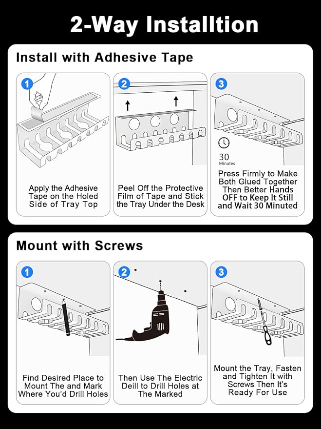 - 【Attention please】: If you choose tape mounting, please note the following three points: 1. To ensure better adhesion of the cable management tray, please make sure to clean the surface before use, the tape should only be applied to clean, dust-free, smooth and flat surfaces; the desk cord organizer is not suitable for dirty, mildewed or peeling surfaces. When installing the cable management under desk with the tape, press firmly for 10 seconds; 2. After installing the under desk cable management, wait 24 hours for the tape to fully cure before placing cables; 3. Make sure the tape is flat and free of wrinkles, which may cause the cord organizer for desk to fall off