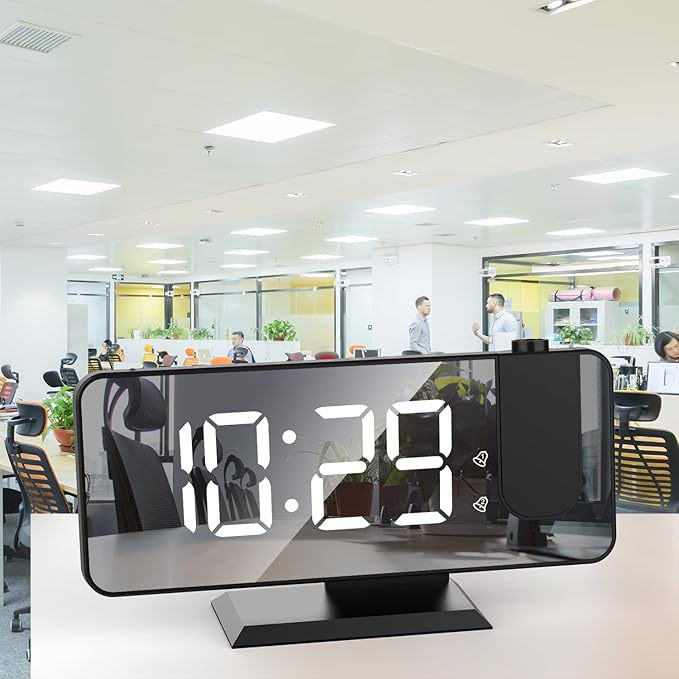 - Large LED Mirror Display: The digital projection alarm clocks is designed with 7.4 inch clear mirror display, even if you are keep away from it also can see the time clearly. It also can be used as a make up miror to convenient for you to take care of dress or makeup.
