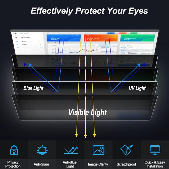 - Protect Your Eyes: Computer Monitor Privacy Filter protects your eyes by filtering 96% of UV rays and suppressing 65% of blue light. It is a reversible privacy screen filter. A matte finish resists glare and softens harsh light, while a glossy is more privacy-resistant. You can choose flexibly according to your needs. In addition to this it also protects your screen from dust and scratches. If you don't know which side has anti-glare function, please contact us at any time