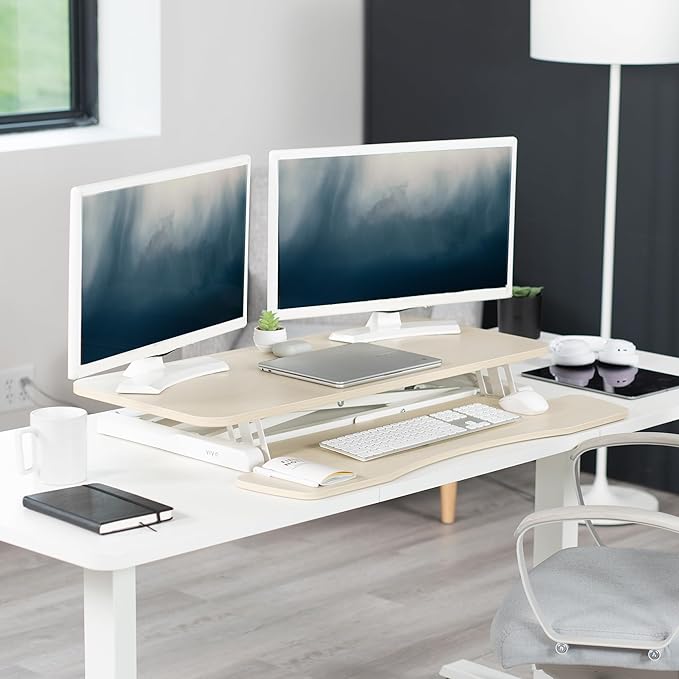 VIVO 36 inch Desk Converter, K Series, Height Adjustable Sit to Stand Riser, Dual Monitor and Laptop Workstation with Wide Keyboard Tray, Light Wood Top, White Frame, DESK-V036KF