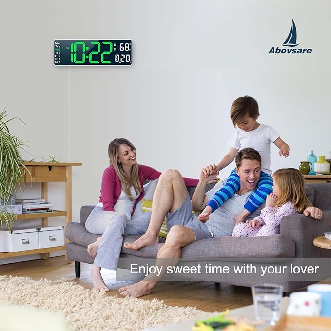 Digital Clock, Digital Wall Clock for Living Room Decor, Desk Alarm Clock for Bedroom, Large Wall Clock with Remote Control, Automatic Brightness Dimmer LED Clock with Date Temperature Week (Green-W)