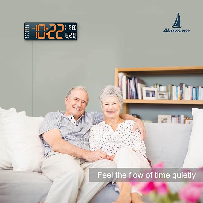 Digital Wall Clock for Living Room Decor, Desk Alarm Clock for Bedroom, Large Wall Clock with Remote Control, Automatic Brightness Dimmer LED Clock with Date Temperature Week (Orange-B)