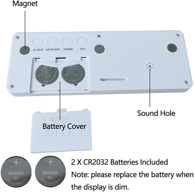 - ✔️Easy to Set: There are four buttons: SET, DOWN, UP/START and CLOCK. Two ways to place it. It has a little removable stand and 3 inset strong magnets at the back to stick on metal surface.