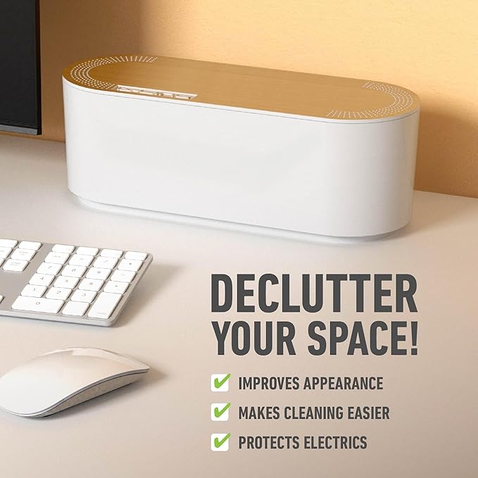 D-Line Cable Management Box, Power Strip Holder, Floor Outlet Hiders, Desk Cord Organizer, Cover TV Wires, Wire Storage, Extension Hider, Office Concealer for Cords - Small, Wood-Effect Lid