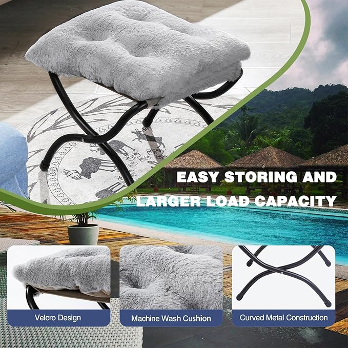 15" Foldable Foot Stool Ottoman with Metal Frame - Washable Faux Fur Grey Upholstered Indoor/Outdoor Footrest for Living Room, Bedroom, Patio - Space-Saving Compact Design