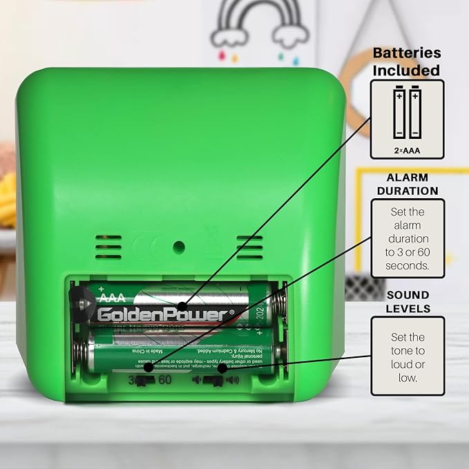 - Easy To Use -- Turn the dial clockwise to adjust the time. To turn the timer off—simply turn back to zero. Requires 2 "AAA" batteries (Included). Set the tone to loud or low, and the alarm time to 3 or 60 seconds. No distracting ticking beep sound.