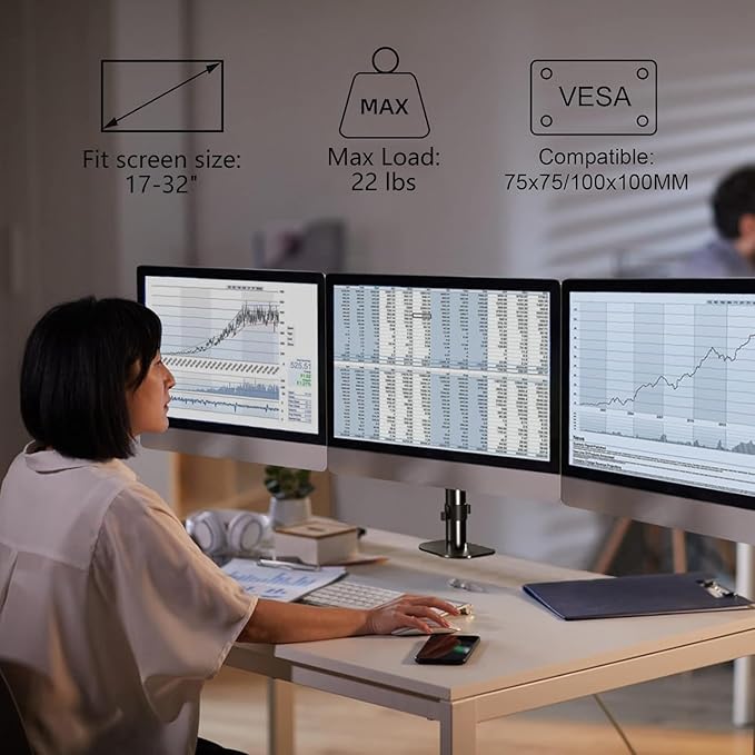 - Ultimate Desk Space Saver: The three monitor mount get displays off your desk conveniently, and the standing pole design helping you to gain a ton of extra space. Integrated cable management to keep cables tucked in arm neatly, hide the sore eyes wire clutter.