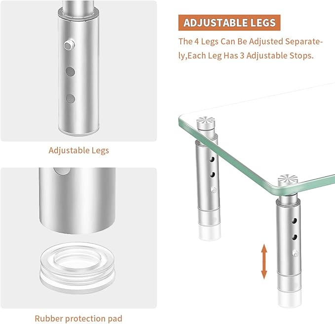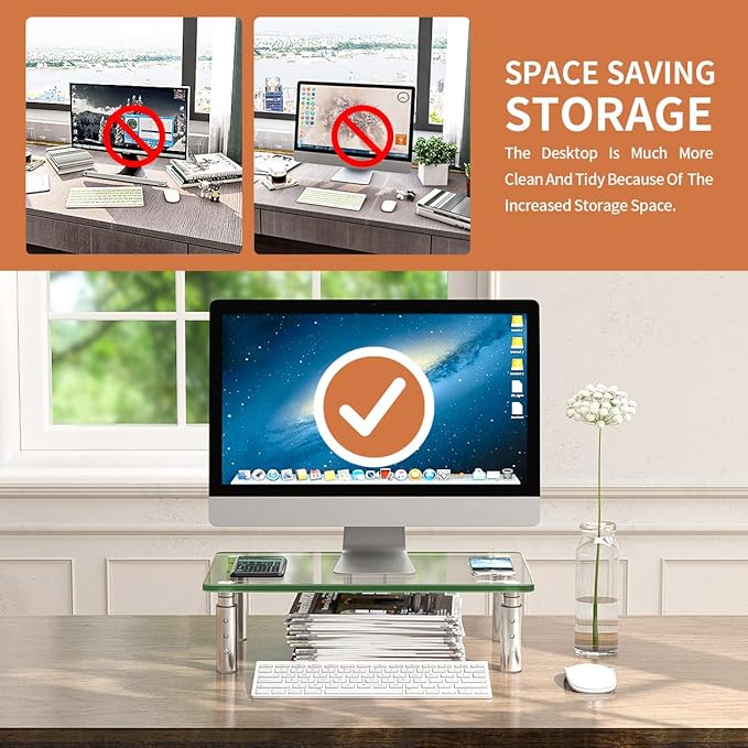- SMART DESIGN: The monitor riser is made of tempered glass and stainless steel legs to make your desktop clean and tidy