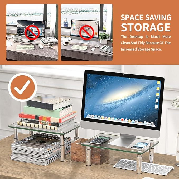 - SMART DESIGN: The monitor riser is made of tempered glass and stainless steel legs to make your desktop clean and tidy