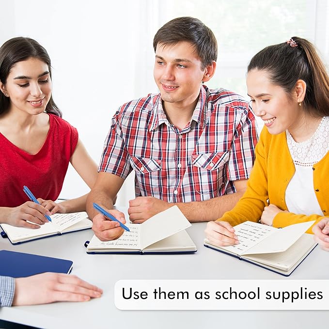 - Feela 18 Pack Classic Ruled Notebooks contains 18 navy ruled sturdy cover notebooks and 18 Black Retractable Pens. Each of the notebooks measures 8.3” x 5.1”, which is perfect to carry and easily held by young girls and boys. These black cute pens are customized to be placed in the pen holder, which is pretty convenient.