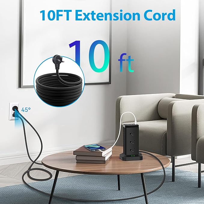 - 【Power Strip Surge Protector 10 FT Cord】Adopting the 16AWG extension cord, the rated current of this charging station outlet tower is 13A. The 10ft extension cord adopts high-quality 100% pure copper wire material to ensure better heat dissipation and conductivity. The 45° right angle flat plug can be plugged into the socket behind the sofa without blocking bottom socket