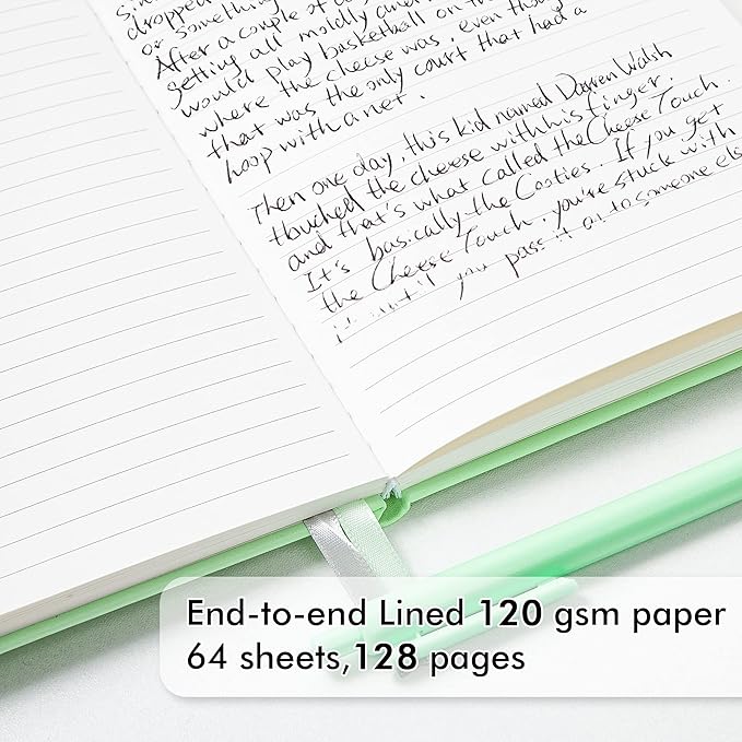 - These classic ruled notebooks are all blank inside with 128 lined pages (64 sheets), which would be convenient for daily usage. The hard cover journal has a water-resistant faux leather cover, round corners and bookmarks, which is designed to lay and open flat. There’s a “date/page” column on the top of every page. You can use it as a reminder to let you remember those important dates and find the page you want in a very short time.