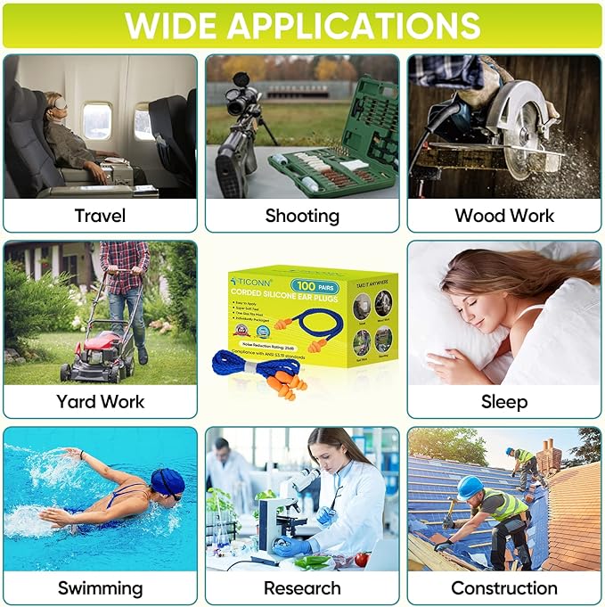- [PORTABLE AND CONVENIENT] Made small, lightweight, and individually wrapped. TICONN earplugs are easy to carry around in a pocket or purse. They can be used anytime, anywhere, and are ideal for use while traveling, sleeping, job site, or studying. This makes them a convenient solution for anyone looking for ear protection. The included cord makes it easy to keep track of your ear plugs and prevents them from getting lost.