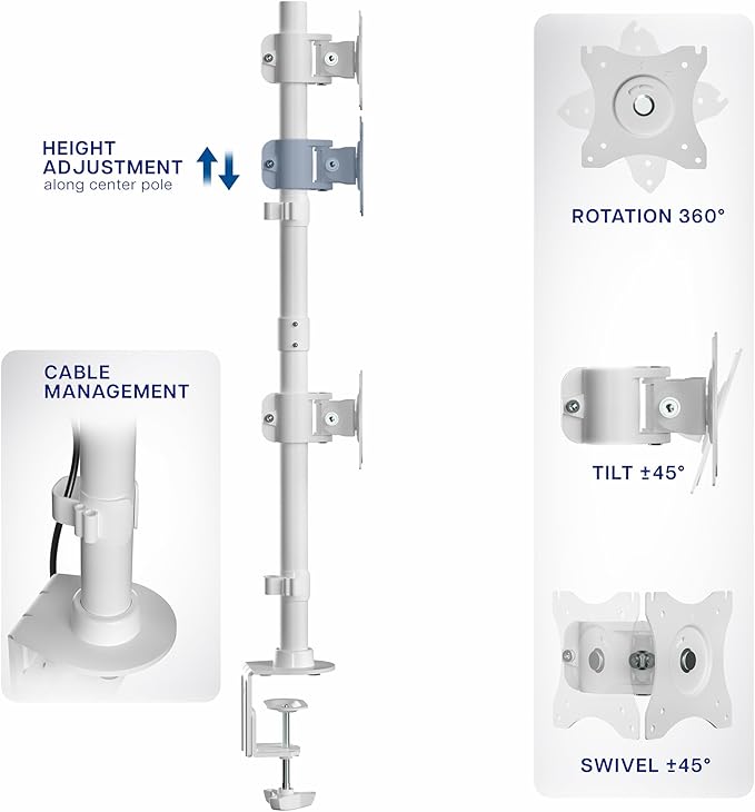 - Vertically Stacked Array: Holds monitors in a stacked position for top and bottom browsing and gaming. Detachable cable clips keep your power and AV cords clean and organized