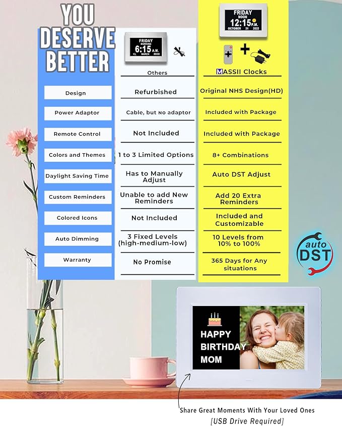 - 𝟮𝟬𝟮𝟱 𝗕𝗲𝘀𝘁 𝗛𝗗 𝗖𝗹𝗼𝗰𝗸 𝘄𝗶𝘁𝗵 𝗩𝗼𝗶𝗰𝗲-𝗧𝗮𝗹𝗸𝗶𝗻𝗴 𝗧𝗶𝗺𝗲 𝗗𝗮𝘁𝗲: MASSII upgraded digital clock (vivid 1280*800HD) clearly displays Time, Day of Week and Date, no confusing comma on date. Additionally, You can also hear the real-time date announcement with the loud voice feature. Backup with 𝘀𝘁𝗮𝗻𝗱𝗮𝗿𝗱 𝗮𝗱𝗮𝗽𝘁𝗼𝗿 𝗮𝗻𝗱 𝗿𝗲𝗺𝗼𝘁𝗲 𝗶𝗻𝗰𝗹𝘂𝗱𝗲𝗱, no battery changes, much safer and more convenient to use for dementia seniors, office work, or school-age kids