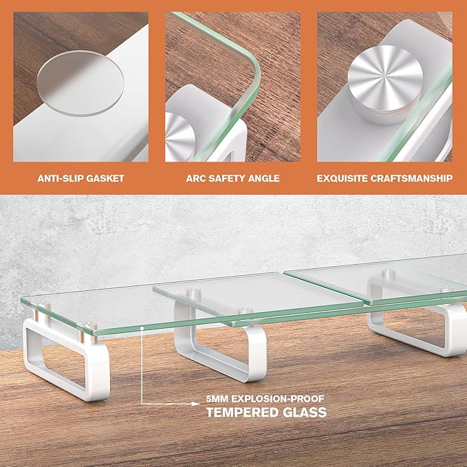 - Personality Design ☞ Our Design team spent a lot of time on this computer monitor stand riser design. The riser top is made of clear tempered glass with round polished edges, not only safe for human body but also looks elegant