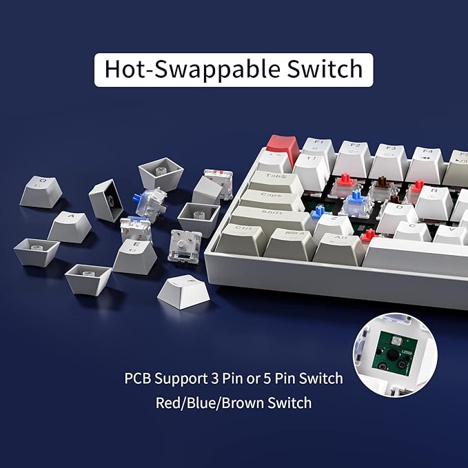 - 【Hot Swappable Mechanical Keyboard】This wireless rgb backlit mechanical keyboard is hot swappable, its socket compatible with most of 3pin and 5pin mechanical switch, enjoy the fun of your own DIY keyboard. With G Pro switch which have 50 million times lifetime. Faster response and longer lifespan vide excellent performance and experience. You can choose from blue, brown or red switches depending on your needs.