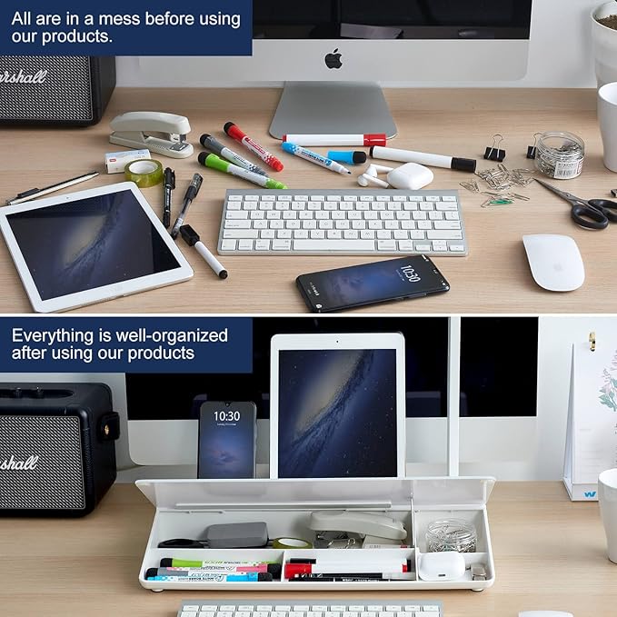 - HIDDEN STORAGE & PAD/MOBILE TRAY: De-clutter your desk by storing markers, magnetic eraser and other desktop accessories in the opening drawer or place markers on the accessory tray for quick access. And one more long tray on the top of the dry erase white board for your pad or mobile.
