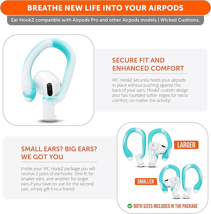 - Secured Fit: One of the most common complaints with Apple Airpod Ear Hooks, is that they push the airpods out of your ears. WC HookZ Airpods Ear hooks were custom designed so they securely fit in your ears without pushing against the back of your ears. Whether you have Airpods 1, 2, 3, or Airpods Pro, keep your airpods securely in your ears no matter what you are doing.