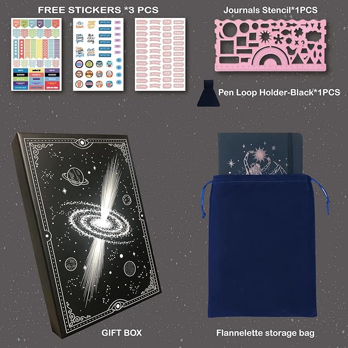 - DETAILS AVAILABLE: This Dotted Journal comes with 2 ribbon page markers, and a gusseted pocket on the inside back cover for loose paper storage. Elastic closure makes sure everything stays where you need it. The gift box package has 3 sheets of journal stickers,1 pcs pen loop holder,1 pcs stencil, and a Flannelette shrink bag inside.