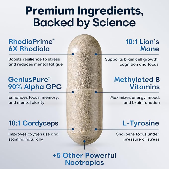 Nootropic Strongest Focus Supplement - Clinically Backed Ingredients Made in USA - Scientifically Backed Doses - Supplement for Brain Fog - AlphaGPC, Lions Mane, Rhodiola and More 10:1 90 Capsules