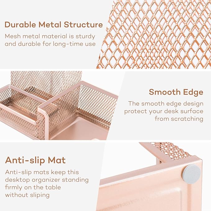 deli Mesh Desk Organizer Office Supplies Caddy with Pencil Holder and Storage Baskets for Desktop Accessories, 3 Compartments, Gold