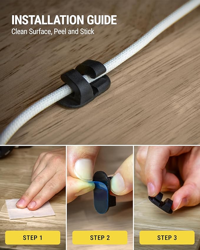 - Easy Installation: Simply peel and stick the cable holder clips onto a clean, smooth surface. Equipped with automotive-grade adhesive, this wire organizer provides a secure and lasting hold, without damaging surfaces or leaving residue upon removal