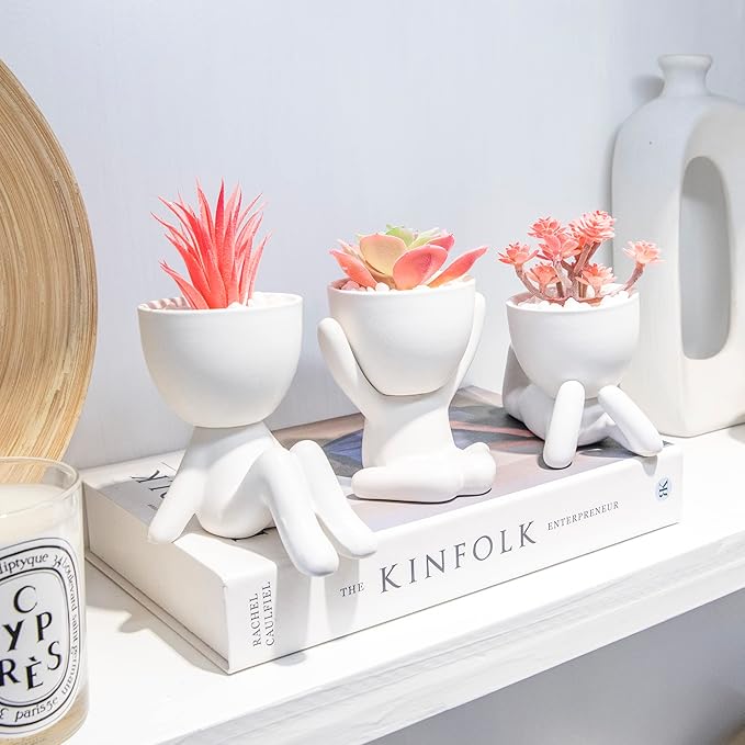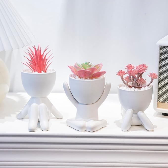 3PCS Human-Shaped Potted Artificial Plants Office Decor for Women and Men, Small Fake Plants Decor for Bedroom and Bathroom, Cute Faux Succulent Desk Decor for Office and Home, Pink