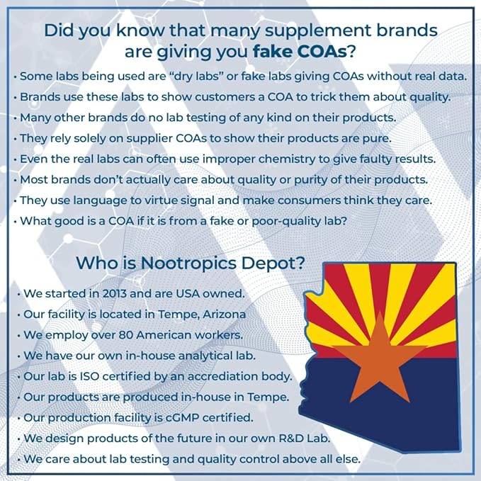 - LAB TESTED AND VERIFIED - All Nootropics Depot products are thoroughly lab tested to ensure our customers are receiving only the highest quality ingredients at the optimal strength, potency and purity. We take pride in the amount of research put into every product by sourcing only the highest quality and innovative ingredients.