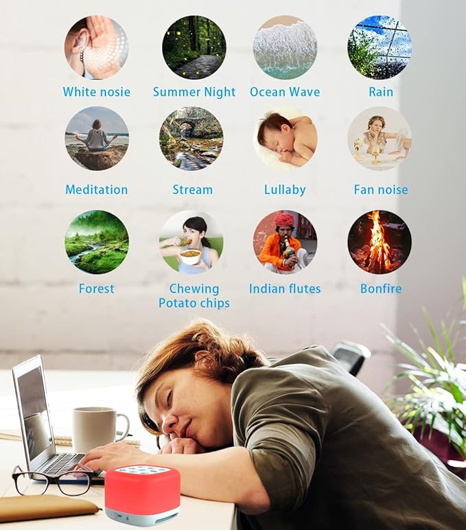 White Noise Sound Machine with Bluetooth Speaker, Night Light 40 Soothing Sounds 9 Color Lights Rechargeable Portable for Baby Kids Adults