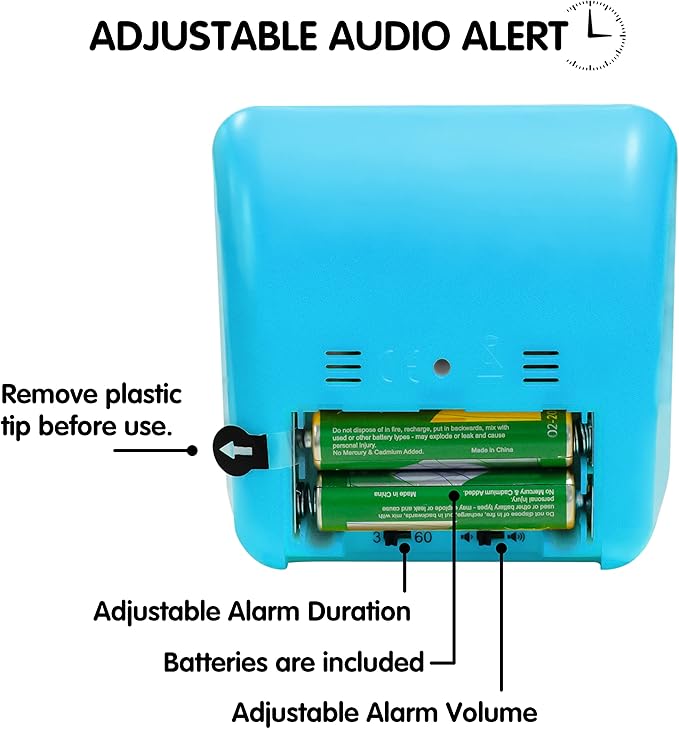 - [ Adjustable Audio Alerts ] Volume and duration of the alarm are both adjustable: 3 seconds or 60 seconds for alert duration, low or loud for alert volume. The timer does not audibly tick, allowing you to focus on your tasks.