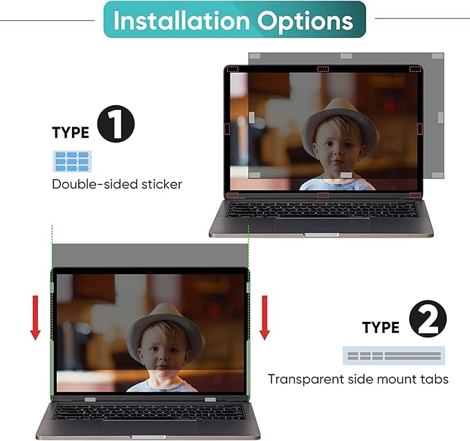 - 【Easy Installation】There are two methods of installation for your laptop screen privacy shield. Option 1 includes high-quality adhesive strips that can be placed on the outer edges of your Privacy filter, and simply attach to your laptop;Option 2 includes slide mount tabs, that attach your bezel on your laptop, allowing you to easily remove your Privacy filter from your laptop screen when needed. All accessories and installation instructions are included