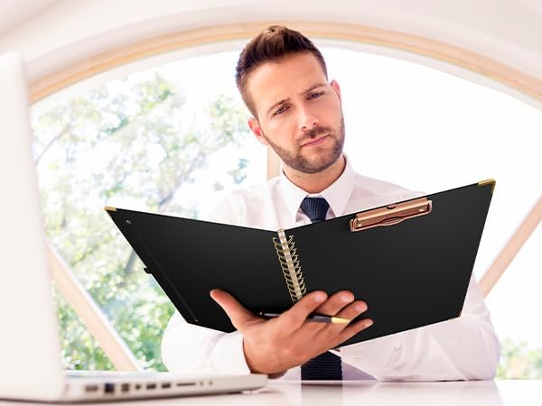 - Portfolio Folder with Clipboard: Everything you need in one - clipboard, folders, and notebook! Our Padfolio is designed for the idea of both multifunctional and dashing, the metal clipboard allows you to jot down notes and it holds up to 80-100 sheets. The elastic side straps not only keep it securely closed but also offer convenient storage for loose papers and small items. The side pen loop enable you to keep your pen stable, while the removable notepad (11*8.5") offers ultimate convenience