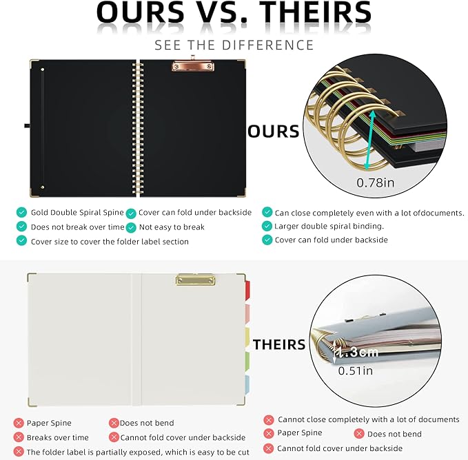 - Premium Material & Ideal Size - Our business portfolio folder is crafted by high-quality cardboard material. And the 0.78'' metal spiral is sturdy and not easily-broken, durable metal reinforced rounded edges are both aesthetically pleasing and effective against wear and tear. So as the poly binder divider(8.5 x 11'') that is water-resistant and anti-tearing. The expanded size is 20.05 x 13.1", and the folded size is 12.02 x 13.1", making it ideal for A4/Letter and a perfect choice for all occasions