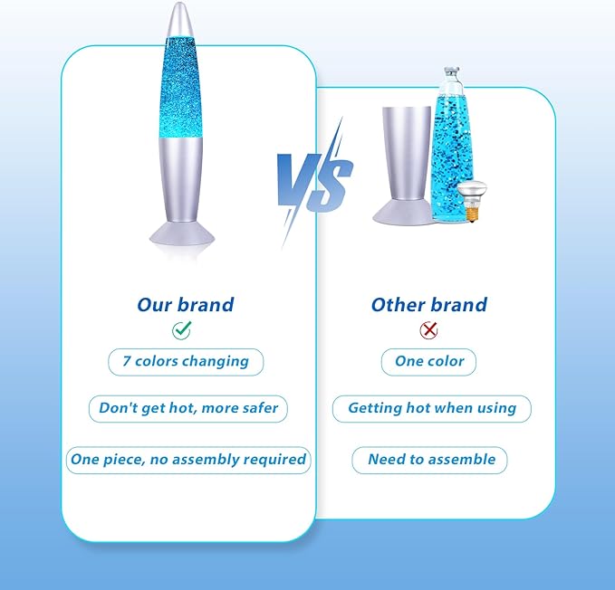 - 【Colorful and Glitter】Glitter motion lamps with clear moving liquid and scraps of sliver turn over and automatically 7 colors such as red, green, blue, purple, yellow, cyan automatically constantly change when you turn it on. Enjoy the magical and relaxing movement of the glittering objects.