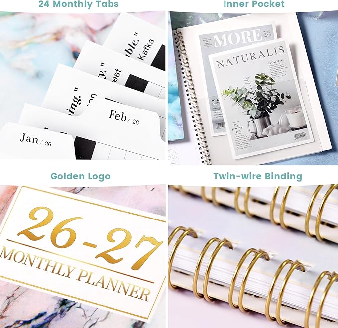 - FUNCTIONAL ORGANIZATION - 2026-2027 monthly planner with 2026-2027 Yearly Overview + 2026-2027 Holidays + Notes Pages + 24 Monthly Printed Tabs + Personal Information Pages + 8 Contact Pages +4 Important Pages Sturdy Twin-wire Binding + Inner Pocket. All of these make the 2026-2027 monthly calendar/planner a perfect choice for leading you a clear life.