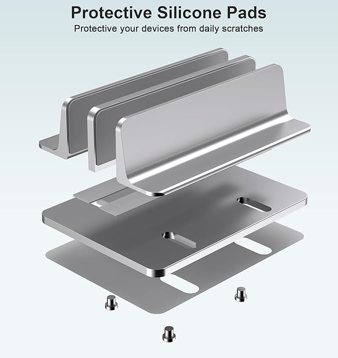 - Protective Mat: Non-toxic and non-slip silicone mats cover the laptop slots to avoid scratches on your devices; non-slip silicone pads pads on the base ensure stability and security
