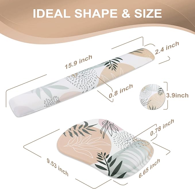 - 3 in 1 Mouse Pad Set: Mouse pad with wrist rest: 9.53 x 6.65 x 0.78 inch, wrist support for keyboard: 15.9 x 2.4 x 0.78 inch, Coaster: 3.9 inch, ldeal mouse pad and keyboard wrist rest to be used with laptop,PC at home,office for long-lasting strength