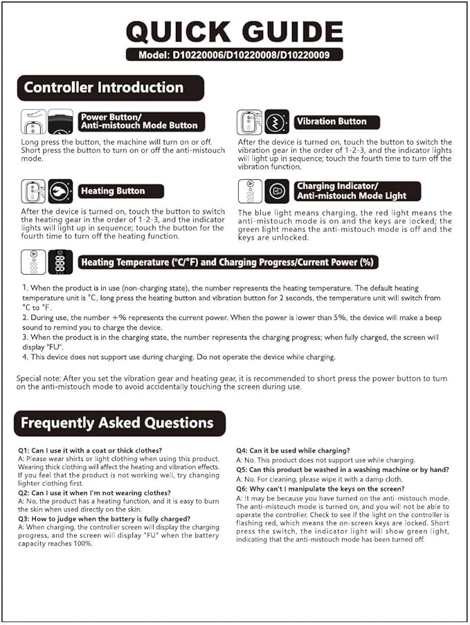 - Wear Suggestion: It is suggested to wear thin clothes when using this item, which will make you feel the heating and vibration function more powerful